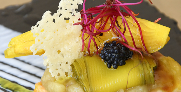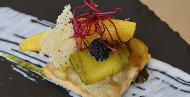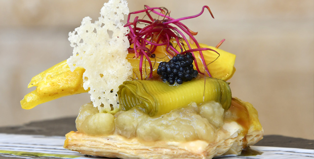 Deconstrucción de coca con verduras con ingredientes de temporada.