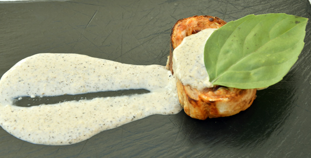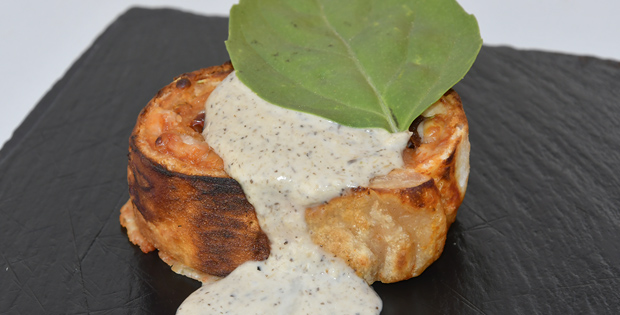 Rollo de masa de pizza relleno de láminas de pollo, bacon,