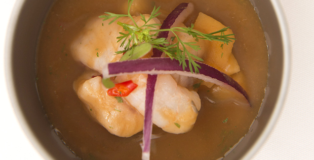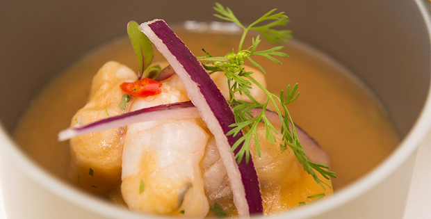 Ceviche de níspero, corvina y quisquilla.