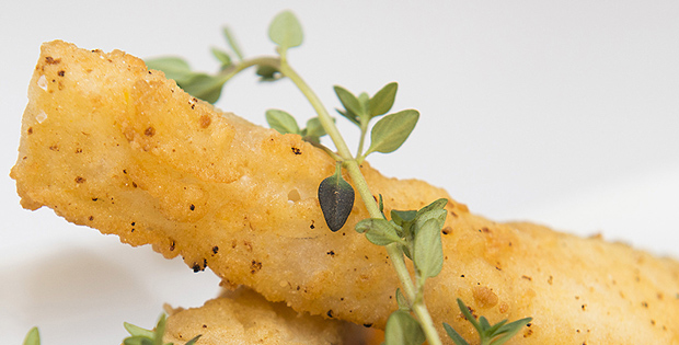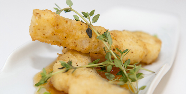 Bacalao frito con mermelada de tomate casero con un toque de romero y decorado con cebollino.