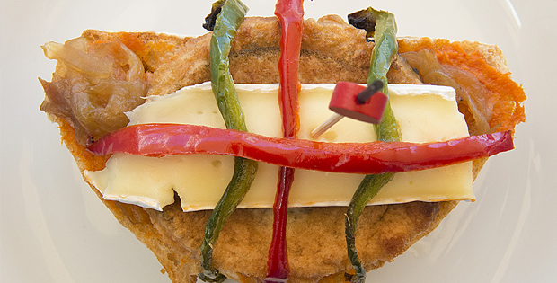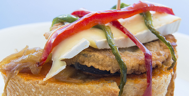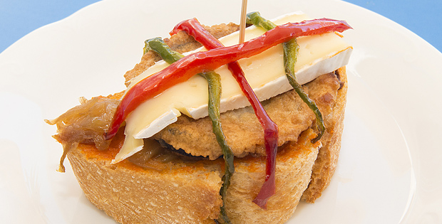 Rebanada de pan rústico con sobrasada ibérica, cebolla caramelizada, pimiento, berenjena y queso brie.
