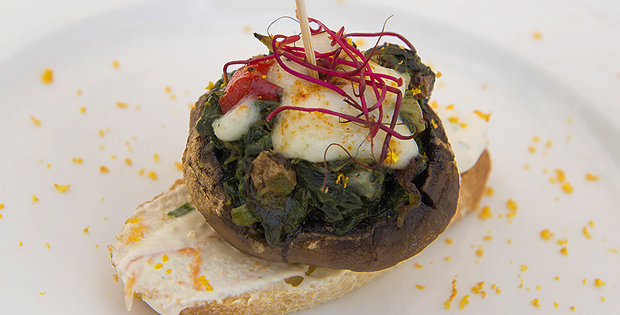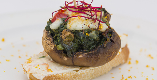 Champiñones rellenos con espinacas y salsa blanca: champiñones, espinaca, cebolla, ajo, pimiento rojo, pasas, queso manchego con trufa, sal, pimienta negra, yogur cremoso, mayonesa, zanahoria, perejil fresco y naranja.