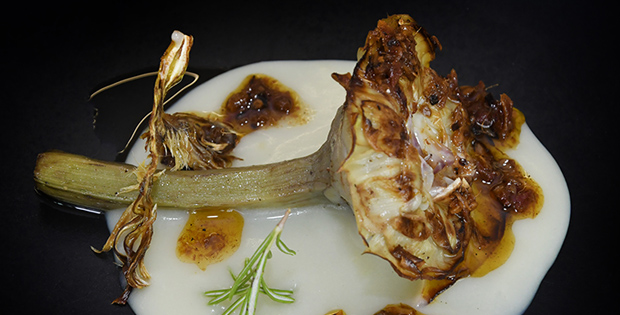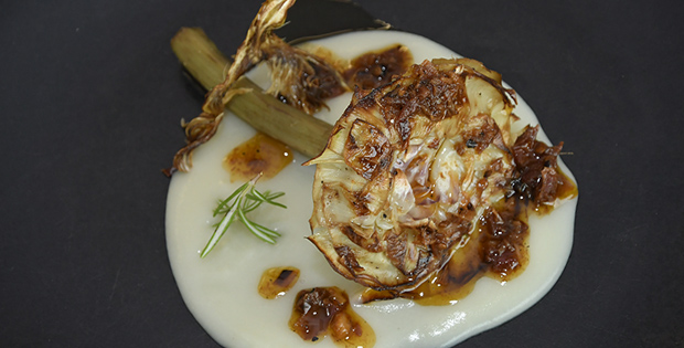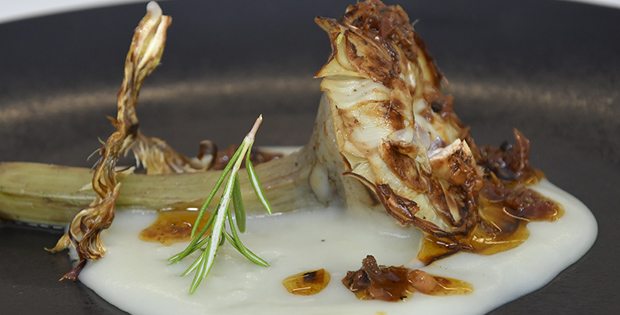 Alcachofa a la brasa, encamada sobre muselina de patata al romero y pericana