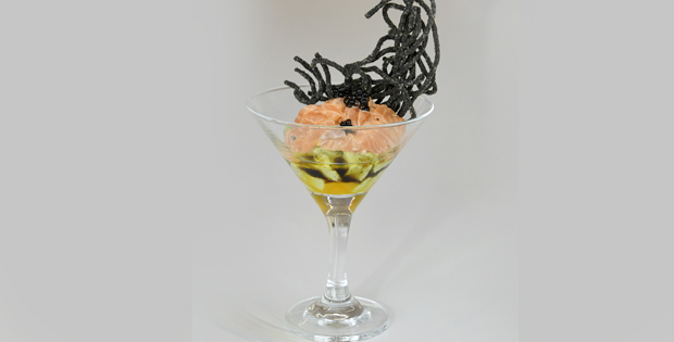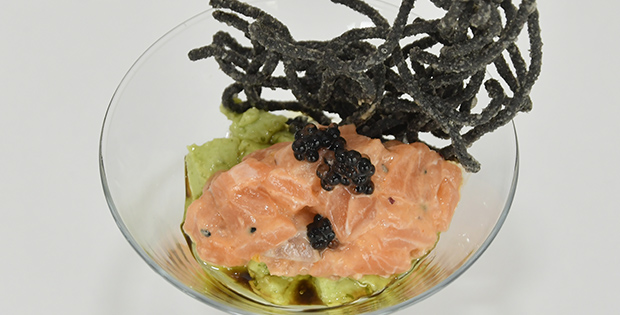 Esponja de aguacate con una quenelle de salmón aderezado con coco y unas esferas de tinta de calamar.
