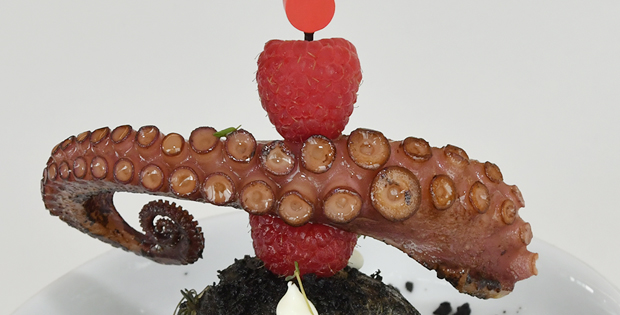 Pulpo sobre trampantojo de carbón de yuca con mayonesa de tomillo, toque de frambuesa y tierra de aceitunas negras.