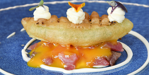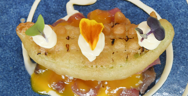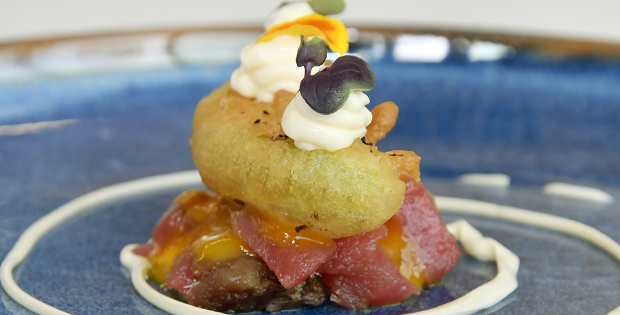 Cama de atún con reducción de mango, y sobre ella una tempura de aguacate con mayonesa ligera de wasabi.