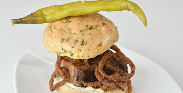 Montadito de panceta a baja temperatura, con mayonesa japonesa, chili y guindilla vasca.