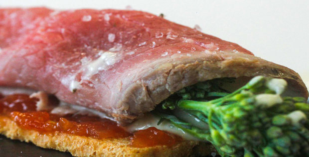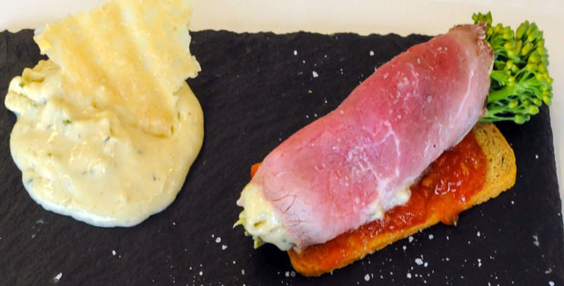 Descripción: Roastbeef sobre una tosta relleno de una salsa de varios quesos, Jack Daniels y bimi con crujiente de queso gorgonzola.