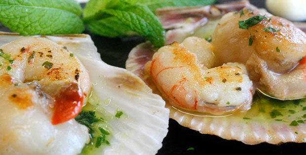 Ingredientes: zamburiña, gamba, lágrimas secreta, salsa morriña Descripción: Encuentro de zamburiñas y gambas en oleaje de salsas y lágrimas secretas.