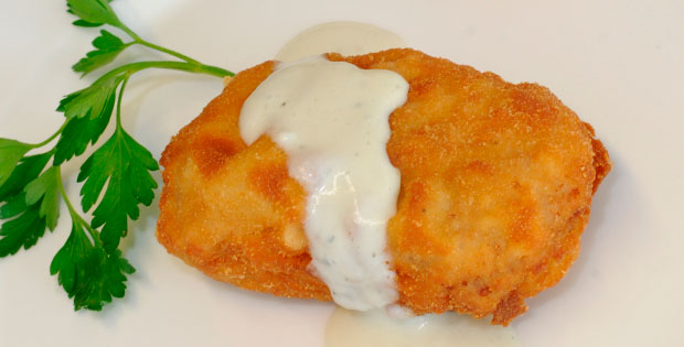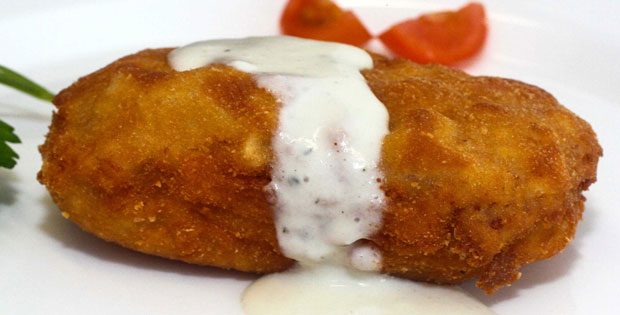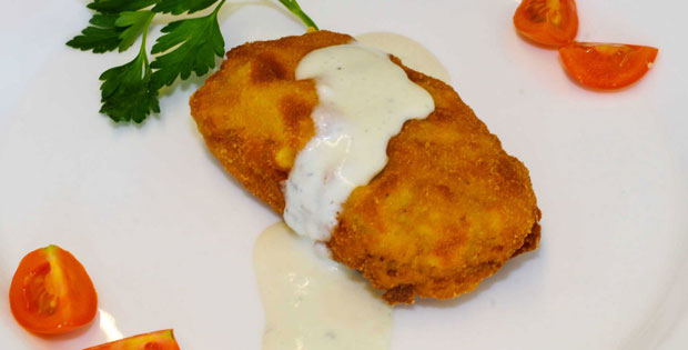 Solomillo de cerdo con manzana, queso y jamón serrano, acompañado con salsa roquefort y miel.