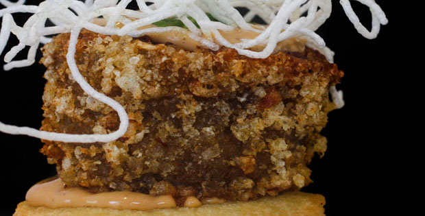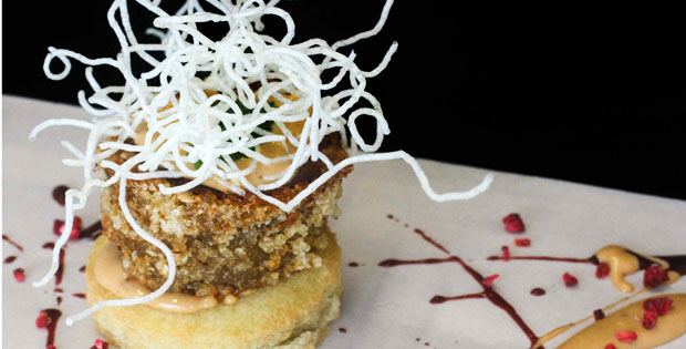 Ingredientes: Confit de pato, salsa hoisim, huevo, fideos de arroz, pan al vapor, frambuesas, liogilizada. Descripción: Jugoso rulo crujiente de pato sobre una torta de pan al vapor con salsa hoisim de frutos rojos.