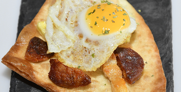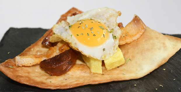 Abanico crujiente bañado de duelos y quebrantos con huevo de codorniz. Horario de tapas. De 10 a 16 horas. Domingos cerrado.
