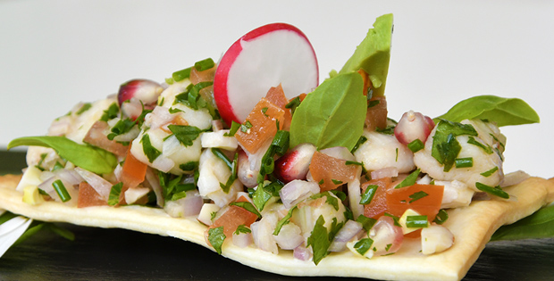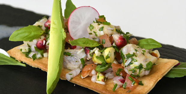 Ceviche de rape con frutos secos al aroma de lima con tomate de Altea, cebolla (chalota), aguacate de origen y ensalada.