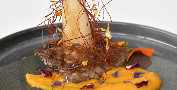 temperatura acompañada de puré de zanahoria y jengibre ahumado con almendras e higo.
