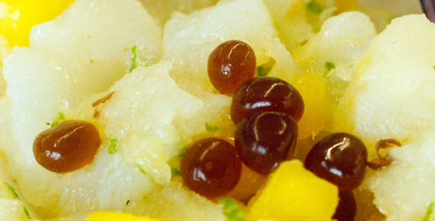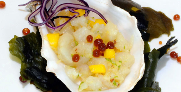 Ingredientes: Corvina, pimienta de Sichuan, lima, mango y mazana granny Smith, aceite de sésamo, ostra, alga wakame, col lombarda. Descripción: Sobre una base de col lombarda se coloca la concha de la ostra con un tartar de corvina realizado con la corvina, el mango, la manzana, la lima, la pimienta y el aceite de sésamo. Se termina con un caviar de salsa de ostras y el alga wakame.