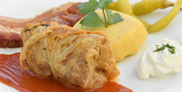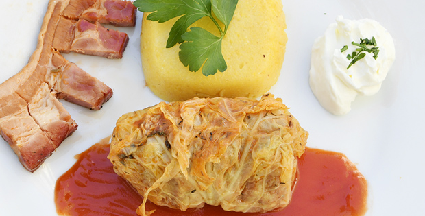 Sarmales (típico de Transilvania). Carne de cerdo y de ternera con arroz y cebolla envuelto en col, acompañado de nata, guindillas, bacon ahumado y harina de maíz (M?m?lig?). Horario de la tapa: De 12:00 a 22:00