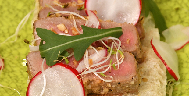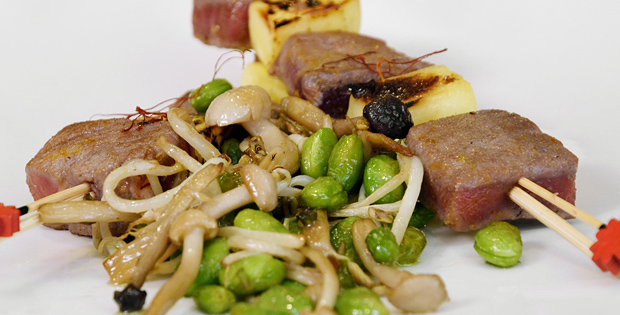 PINCHO/ TAPA Tataki de atún con cacahuetes sobre galleta cracker 4.50 € PLATO 2 morunos de atún con mango 15,00 €