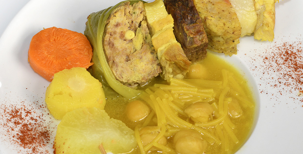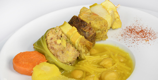 Delicioso caldo de puchero con pelota de carne y brocheta de acompañamiento.