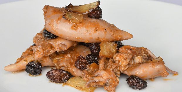 Calamares de bahía en salsa, sobre cama de cebolla caramelizada y pasas sultanas.