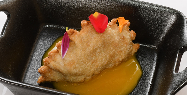 Empanadilla tradicional rellena de pollo al curry, con una base de texturas de piña colada.
