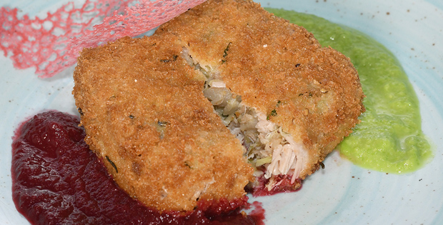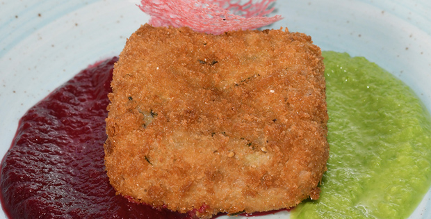 Corazón de alcachofa con secreto ibérico cocinado a baja temperatura y empanado sobre crema de guisantes.