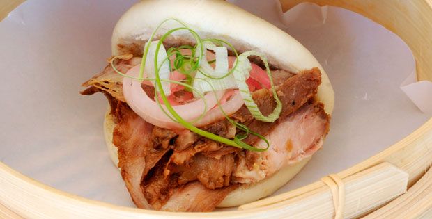 Ingredientes: Bao, abanico de cerdo ibérico, jengibre, soja, cebolleta tierna, cebolla encurtida. Descripción: cocemos el Bao (pan Tai), y rellenamos con abanico ibérico, le ponemos las cebollas y aderezo para contraste de texturas y sabores.