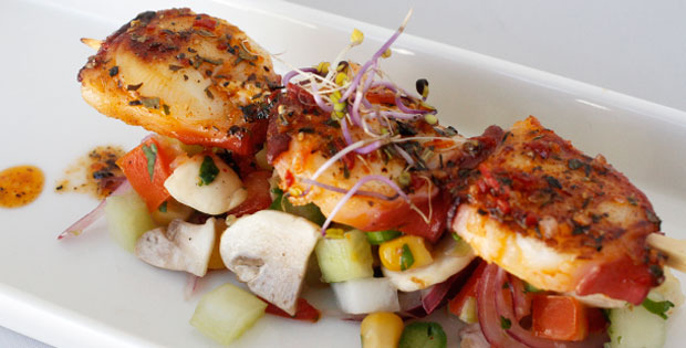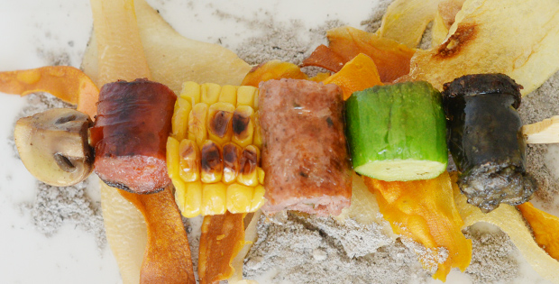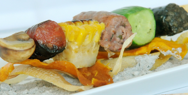 Ingredientes: Pulpo, espárragos, maíz, cebolla, lima, chimichurri, vinagre, sal, pimienta. Descripción: Pinchar el pulpo en la brocheta. Reservar. Cortar la verdura a dados regulares y aliñar. Marcar el pulpo en la plancha y añadir chimichurri.