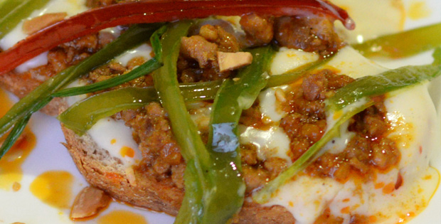 Pan, carne en salsa, pimiento y cebolla caramelizados, bechamel, y almendras tostadas