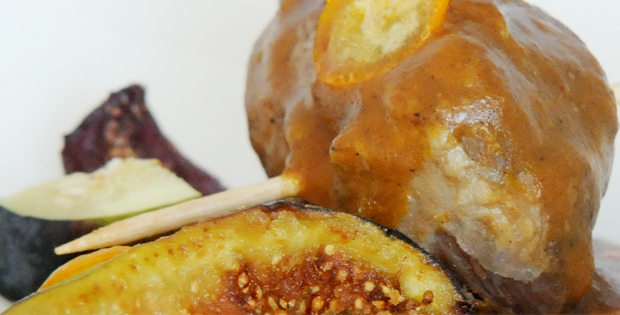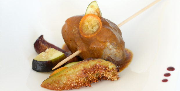Brocheta de carrillera estofada en su jugo reducido con vino tinto e higos