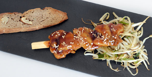 Pollo a la plancha macerado con soja, brandy, miel y jengibre, decorado con sésamo dorado sobre pan casero de nueces