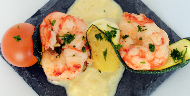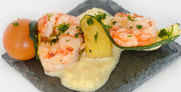 Brocheta de gambón al ajillo con láminas de calabacín a la plancha y piña
