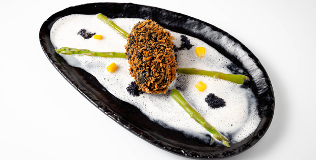 Bocado cremoso de patata y remolacha con gamba, leche de coco y lima, aromatizado con albahaca y lemongrass