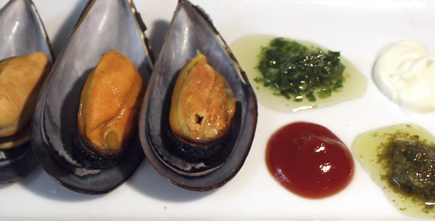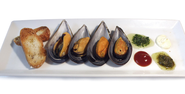 Mejillones al vapor condimentados con cuatro salsas al gusto. Horario: De 12:00 a 20:00
