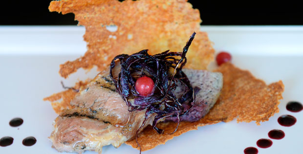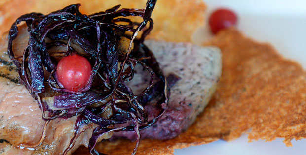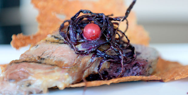 Pluma ibérica al horno de leña sobre una base de pastel de arándonos y crujiente de pan con reducción de vino tinto y decorado con col lombarda