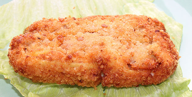 Lasaña en costra de ternera, queso parmesano y pasta fresca, empanada y frita.