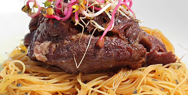 Carrilera en su jugo sobre lecho de fideos chinos de arroz y salsa de soja. Precio de tapa + cerveza o vino o refresco De lunes a domingo de 12:00 a 14:00h y de 19:00 a 23:00h