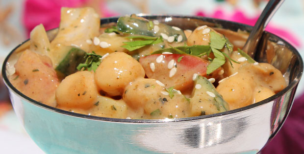 Cóctel frío de garbanzos, tomate, pepino y cebolla, aderezado con vinagreta de menta, tamarindo, mango y diferentes especias. Precio de tapa + cerveza o vino o refresco De martes a domingo de 12:00 a 16:00h. Lunes cerrado