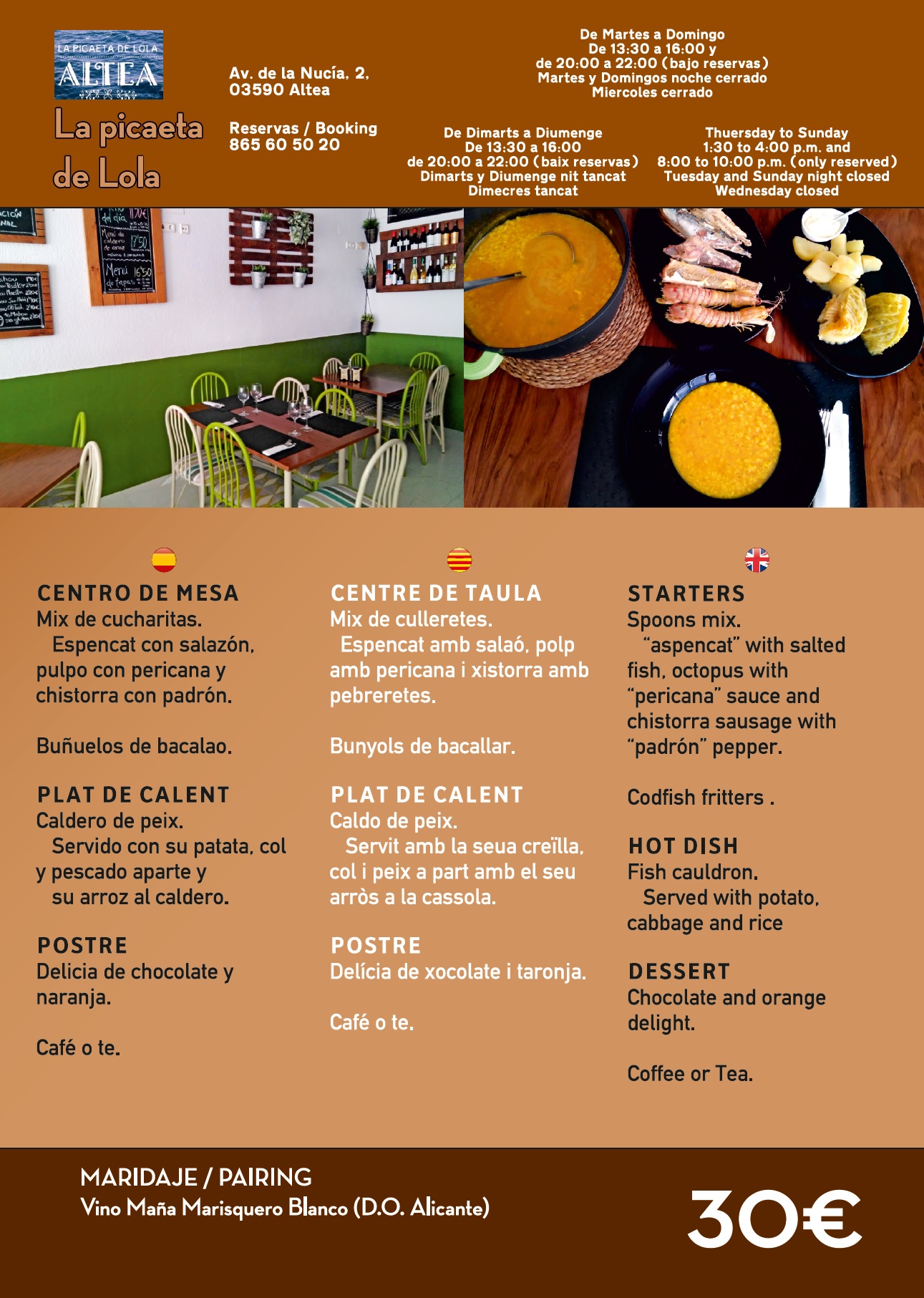 Horario de 13 a 16. De 20 a 22 horas bajo reserva. Dias de cierre: Miércoles, Martes noche y Domingo noche.