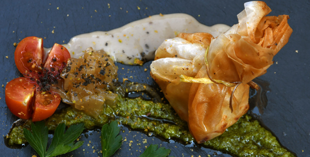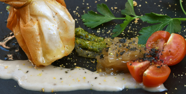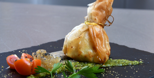 Pechuga de pollo con queso y salsa de mostaza y miel envuelto en saco de hojaldre, acompañado de salsa de pesto, boletus, sal negra, cebolla, tomate cherry y ralladura de pistacho. Maridalo con una cerveza 1/5 Alhambra o una copa de vino Embaucador.