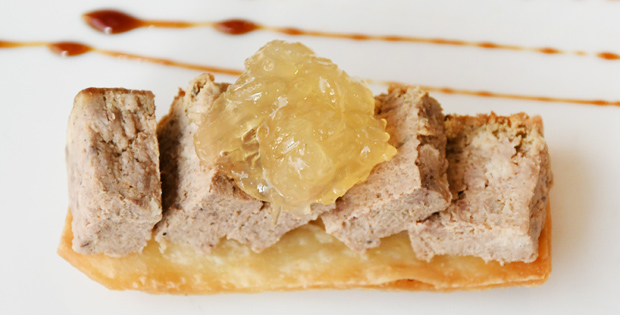 Paté de faisán con cabello de ángel sobre crujiente de trigo. Maridalo con una cerveza 1/5 Alhambra o una copa de vino Embaucador.