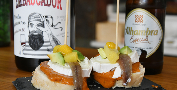Maridalo con una cerveza 1/5 Alhambra o una copa de vino Embaucador.