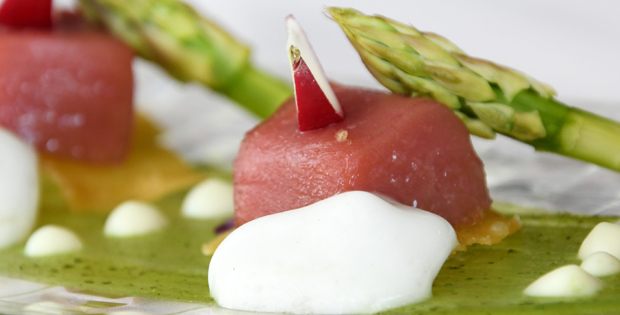 PINCHO/ TAPA Habanito de atún rojo 6 € PLATO Tataki de atún con crema de albahaca, parmentier de wasabi, espárragos verdes y aire de piña 18 €