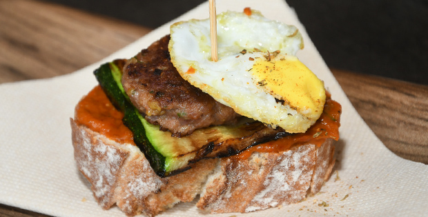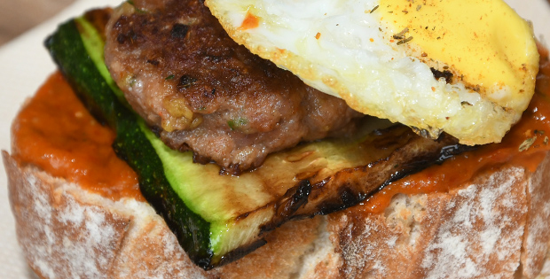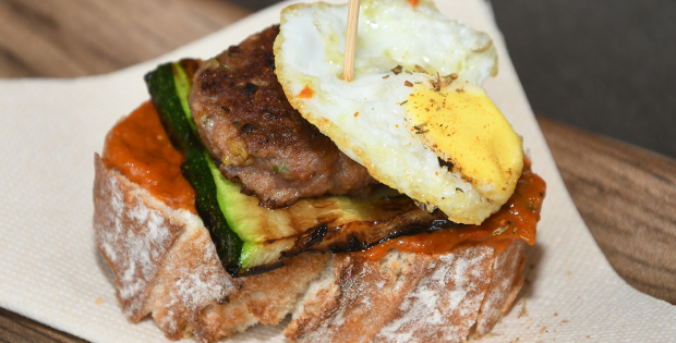 Sobre el pan canapé de calabacín y ensalada fresca de pimientos rojos y berenjena asada. Hamburguesa mini de ternera con huevo de codorniz.