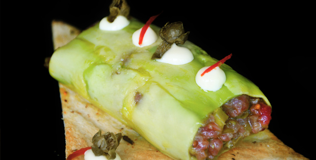 Steak tartar macerado al estilo tradicional, presentado con una fina lámina de aguacate que lo envuelve.