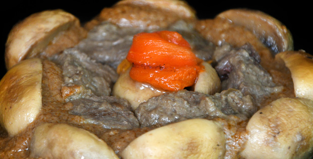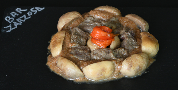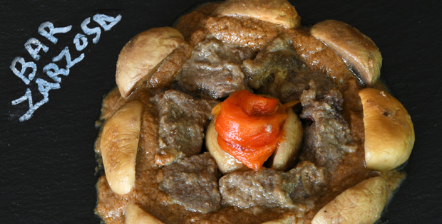 Entrecot bañado en salsa de champiñón, aderezado con vino y pimientos asados. HORARIO TAPA : DE 11.00 A 23.00