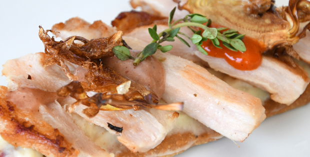 Pan tostado, bechamel de jamón de bellota, secreto ibérico Don Saturnino, chips de alcachofas, coulis de pimiento, oporto y reducción de Pedro Ximénez.