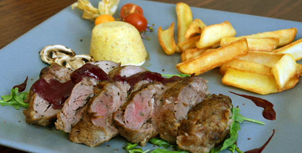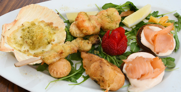 - Fantasía de mar ( 1 mejillón tigre, 1 brocheta de calamar, 1 brocheta de cola de gambas, 2 tapas de salmón ahumado en su espuma y 1 carne de vieira. - Sorbete de Mango. - Pluma de cerdo ibérico con salsa de frutos rojos y polenta. - Semifreddo de turrón. Bebida: 1 botella (2 personas) de Rioja 1000 hojas o rosado o blanco Rueda Centum. Agua incluida.
