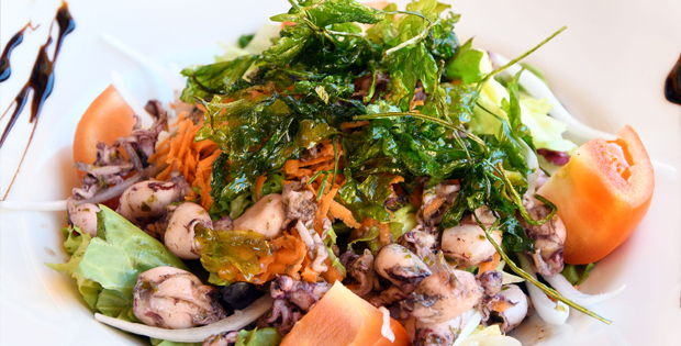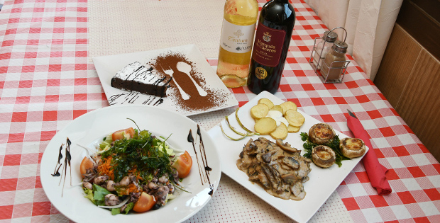 - Ensalada templada de chipirones con cebolla caramelizada y queso de oveja. - Solomillo con boletus, crema de queso con pomme parisienne y champiñones rellenos de mozzarella. - Tarta de chocolate negro con almendras. Bebida: Vino rioja o rueda (1 botella para 2). CERRAMOS LOS MARTES