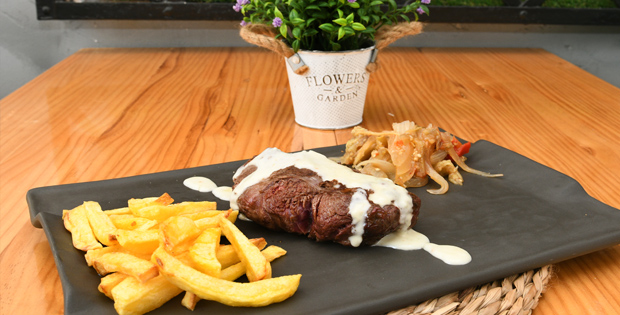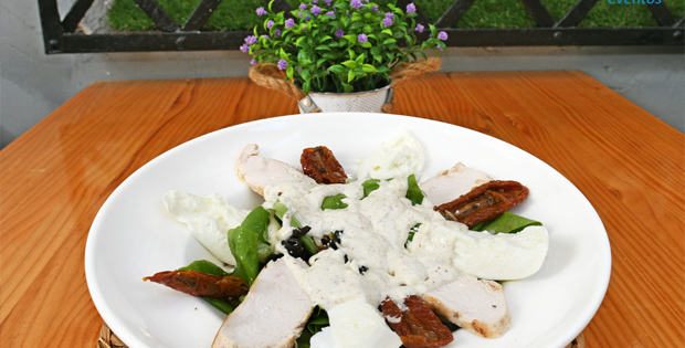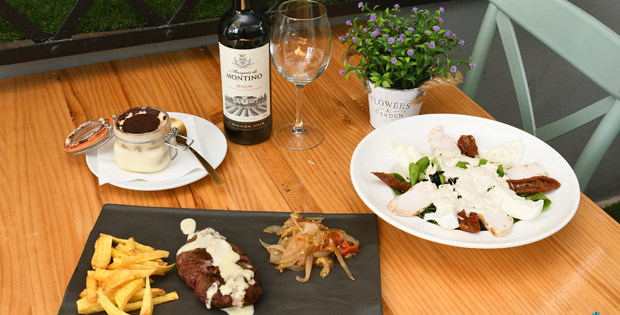 Entrante: Ensalada Fiorentina con lechuga viva, pollo a la parrilla, tomate semiseco y mozzarella de búfala. Principal: Entrecote con crema de queso Gorgonzola, patatas fritas y escalibada. Postre: Tiramisú casero. Bebida: Vino, cerveza, refresco o agua.