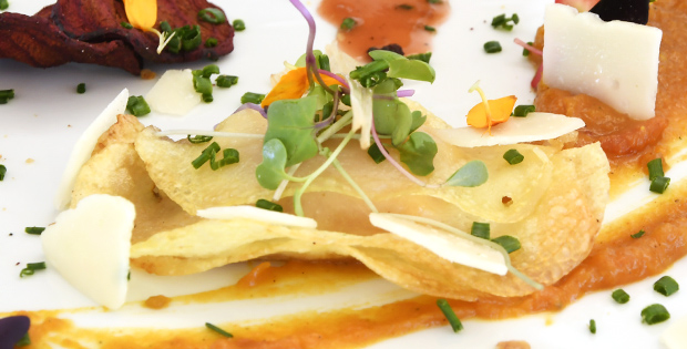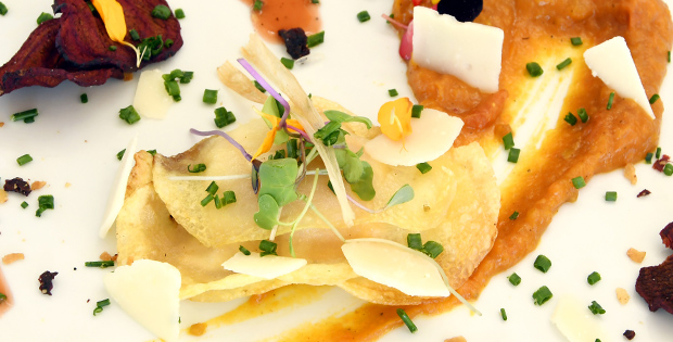 Ravioli de patata relleno de yema de huevo montada en salsa ponzu chutnai de calabaza, albaricoque, crujiente de remolacha y granada. HORARIO DE TAPA: De 12:00 a 16:30; de 19:00 a 23:00hrs. Domingo cerrado.